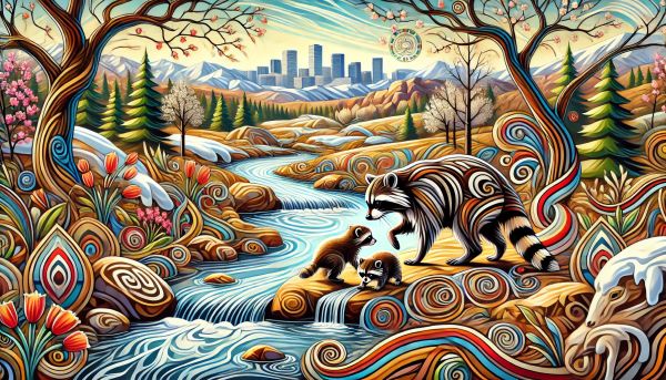 Title: Spring Unfurls in Denver: Raccoons Amidst Snow-Kissed Streams Photo ID: 56359