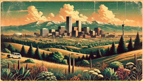 Title: Retro-Inspired Denver Landscape with Rolling Hills and City Skyline Photo ID: 56805 |