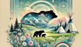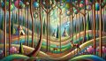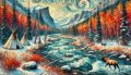 Enchanting Cubist-Inspired Forest Landscape with Deer and Teepees