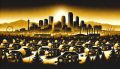 Evocative Decopunk Artwork of Denver, Colorado Featuring Mountain Backdrop