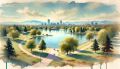 Tranquil Watercolor of City Park, Denver with Lush Scenery and Skyline