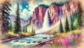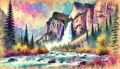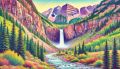 Vibrant Watercolor Interpretation of Bridal Veil Falls Amidst Rocky Terrain