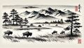 Tranquil Sumi-e Landscape of Bison Grazing in the Rocky Mountains